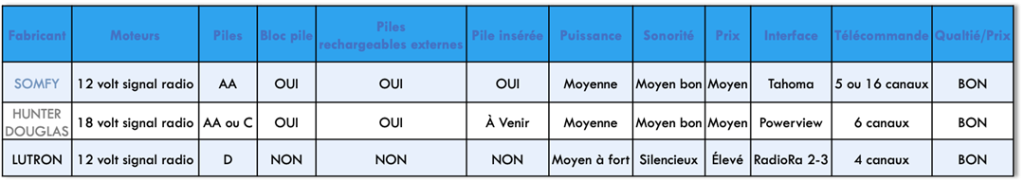 Différents fabricants offrent des moteurs à piles mais tous n’ont pas la note de passage à mon humble avis. Je vous suggère de consulter le tableau préparé ci-dessous pour vous donner plus d’informations sur les fabricants les plus performants de produits vendus au Québec et certaines caractéristiques de leur moteurs de toiles à rouleaux.